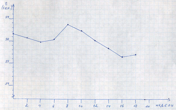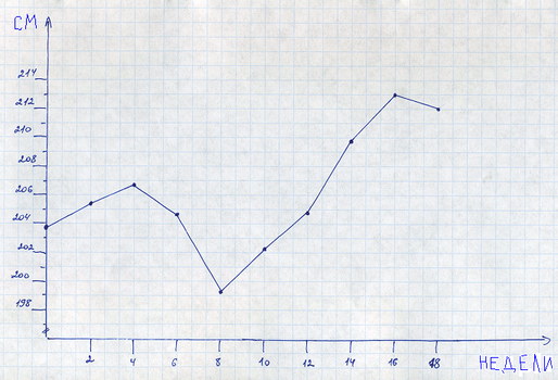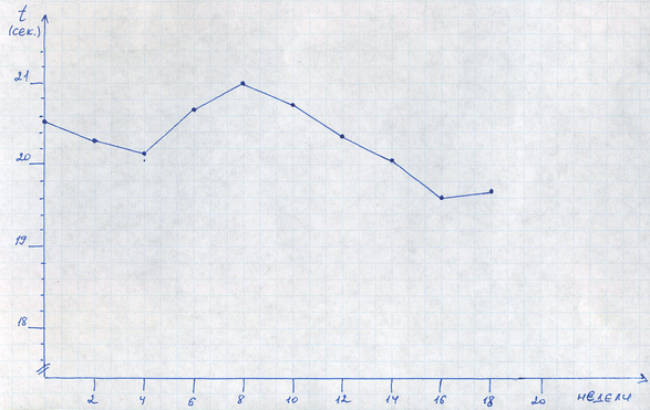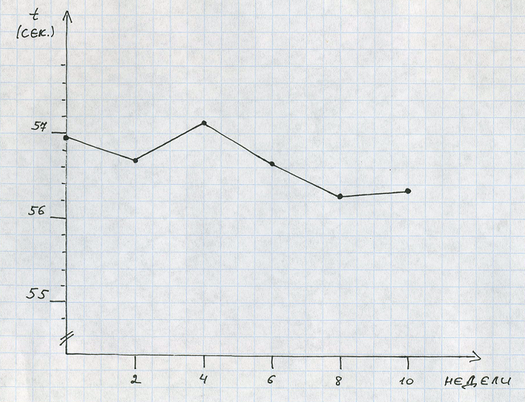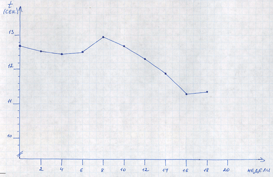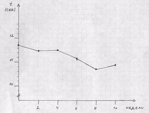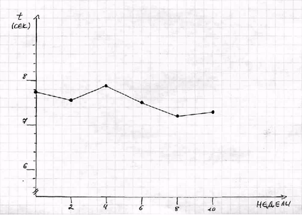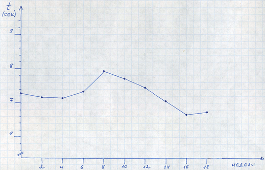 После этого я приступила к изучению реализации отставленного тренировочного эффекта. С этой целью каждые две недели проводилось тестирование физической подготовленности.
