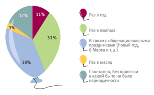 Также компании, проводящие корпоративные мероприятия, стараются максимально обогатить мероприятие, дав ему добавленную стоимость (например, пригласить на конференцию специалистов с женами и детьми, устроив для последних туристические экскурсии). Периодичность проведения корпоративных мероприятий, проводимых в крупных российских компаниях представлены на рис. 1.2.