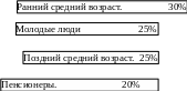 Молодые люди. Возрастная группа, включающая людей от 20 до 34 лет. Наиболее активная часть населения, динамично внедряющаяся в бизнес. Характеризуется широкой дифференциацией интересов и стремлений, высокой восприимчивостью к новизне.