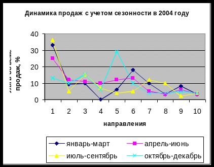 Из таблицы 9 следует, что в марте 2004 года - самый низкий объем продаж. Однако коэффициент сезонности был выше это можно объяснить тем, что в апреле и марте 2004 года турфирма ООО «Марко Поло» не проводила рекламную кампанию для привлечения туристов. Также необходимо сглаживание сезонных колебаний. Т.е., например, в феврале, марте, когда идет снижение продаж, можно предлагать скидки туристам для поездок в это время.