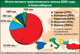 В летний период наблюдается резкий скачок продаж путевок в Турцию, в Италию, на Крит и в Египет. Весной основной объем продаж идет за счет экскурсионных маршрутов по городам Европы, а также за счет продажи путевок в Турцию и Египет.
