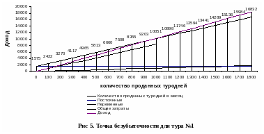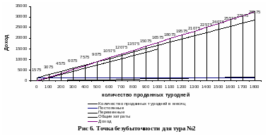 Точка безубыточности производства для тура №1 находится примерно на уровне 900 туродней в месяц, т.е. для того чтобы фирма работала «в ноль» необходимо реализовывать 180 путевок в месяц (5 групп по 35 человек).