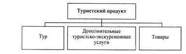 В свою очередь, туристский продукт как совокупность вещественных (предметы потребления) и невещественных (услуги) потребительских стоимостей, необходимых для полного удовлетворения потребностей туристов, возникающих во время их путешествия, состоит из трех элементов: тур, дополнительные туристско-экскурсионные услуги, товары. Все они отображены на рисунке 2.