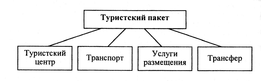 Иногда туристский продукт ассоциируют с понятием «туристский пакет» - основным (обязательным) комплексом услуг, предоставляемых в путешествии по индивидуальному или групповому плану, который имеет серийный характер, предлагается в широкую продажу. Туристский пакет включает четыре обязательных элемента: туристский центр, транспорт, услуги размещения, трансфер. Структура туристского пакета представлена на рисунке 1.