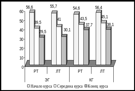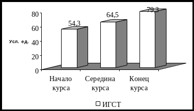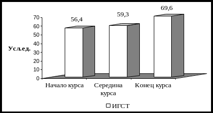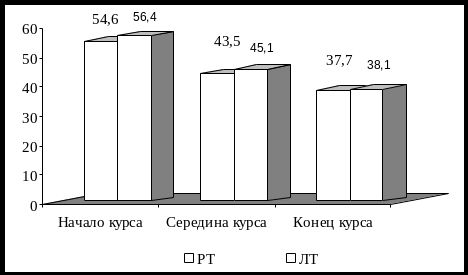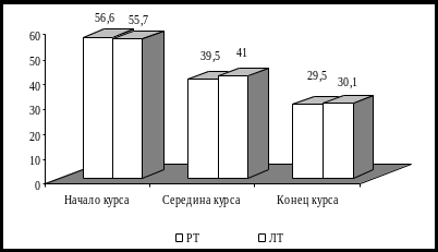 Уровень ситуативной и личностной тревожности в обследованной группе характеризовал наличие выраженной тревоги и составлял – 56,6±1,8 и 55,7±1,5 балла соответственно. Средний уровень, как ситуативной так и личной тревожности в середине курса свидетельствовал о умеренном уровне эмоционального напряжения.