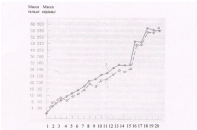 Рис. 1. Увеличение массы тела (1) и массы сердца. Возраст, годы