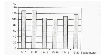 Возрастная динамика физической работоспособности юных футболистов по отношению к работоспособности нетренированных сверстников, принятой за 100%.