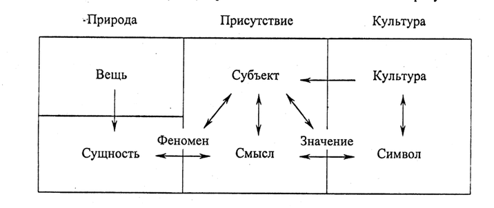 Природа, как показано на схеме, изолирована от субъекта. Приближение к ней происходит в результате соотнесения феномена переживания (стрелка, касающаяся «сущности» и направленная на «феномен» понимания). Центральное место в онтологии присутствия