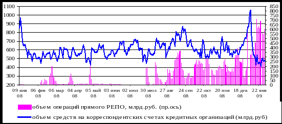 Существенное ухудшение с августа 2008 года ситуации на мировых финансовых рынках обусловило масштабный отток капитала из России, как и из других стран с развивающимися рынками. Значительная переоценка рисков участниками как на международных, так и на внутреннем финансовых рынках стала причиной ужесточения условий заимствований для российских кредитных и нефинансовых организаций, а также ухудшения функционирования финансового и фондового рынков страны. Затруднение привлечения средств на рынке межбанковских кредитов (в том числе формирование цепочек неплатежей по операциям междилерского РЕПО) в совокупности с критическим ухудшением ситуации на рынке ценных бумаг (резкое снижение котировок акций и облигаций российских эмитентов и основных фондовых индексов, приостановка торгов на российских биржах) нарушило нормальное функционирование рыночного механизма перераспределения ликвидности, следствием чего стали формирование дефицита банковской ликвидности и резкое повышение спроса кредитных организаций на рефинансирование со стороны Банка России.[31]