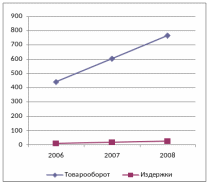 Из табл. 2.1 видим, что уровень издержек обращения в 2007 году по сравнению с 2006 годом увеличился на 0,9 процента, а в 2008 году по сравнению с 2007 годом он увеличился на 0,12 процентов и составил 3,02 процентов. Это означает, что величина коммерческих расходов, приходящаяся на 1 руб. товарооборота, увеличилась с 2,9 копеек до 3,02 копеек. Данная тенденция является негативной, что требует дополнительного анализа коммерческих расходов.