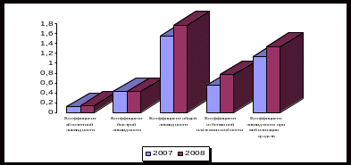 Все нормативные коэффициенты, необходимые для платежеспособности и финансовой устойчивости предприятия, находятся достаточно близко к нормативным значениям. Во вторых, в 2008 году наблюдается повышение их абсолютной величины. Повышение коэффициента общей ликвидности свидетельствует о повышении уровня платежеспособности предприятия.