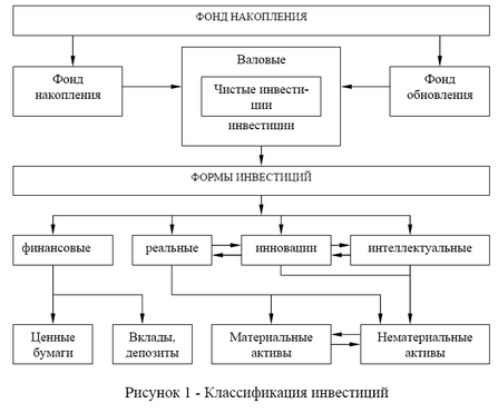 На рис. 1.1 приведена схема классификации инвестиций по формам. Фонд накопления как сберегаемая часть национального дохода является основным источником инвестиций. Условно он может быть подразделен на фонд возмещения и фонд обновления. За счет этих фондов осуществляются соответственно валовые и чистые (в их составе) инвестиции.