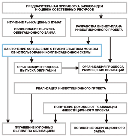 Рассматриваемая схема предполагает осуществление инвестиционного процесса в условиях разработки и реализации инвестиционного проекта, требующего краткосрочных и долгосрочных капиталовложений, объемы которых превышают собственные возможности предприятия. При этом экономический потенциал предприятия позволяет обеспечить привлечение инвестиционных ресурсов с использованием рынка ценных бумаг на основе эмиссии корпоративных облигаций и получения определенной финансовой поддержки из средств городского бюджета.