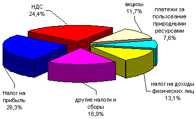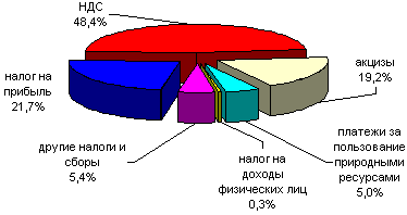 Структура поступлений налогов и сборов в федеральный бюджет по видам налогов за январь-декабрь 2003 года (в %)