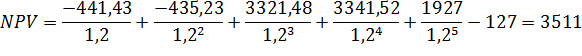 Чистая текущая стоимость проекта (NPV) при ставке сравнения 20% годовых и интервале планирования 5 лет составляет: