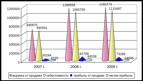 В 2009 г. по сравнению с 2008 г., напротив, наблюдается снижение финансовых показателей. Темп роста выручки не такой высокий как в предыдущем году – всего 101,30%. Себестоимость продаж повысилась на 24728 тыс. руб. или на 2,28%. Снижение чистой прибыли предприятия на составило за данный период 19943 тыс. руб. или на 44,78%. Темп роста заработной платы в 2009 году по сравнению с 2008г. (109,64%) опережает темп роста производительности труда (102,51%), что является также негативной тенденцией. Для большей наглядности представим основные технико-экономические показатели в виде рисунка 1.