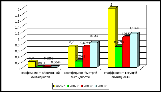 В 2007 году все показатели платежеспособности ниже нормативных значений. Однако в 2008-2009 годах показатели ликвидности незначительно повысились и также не превышают нормативное значение. В срочном порядке предприятие не сможет погасить свои краткосрочные обязательства, из-за недостатка денежных средств. Об этом свидетельствует коэффициент абсолютной ликвидности, который составил в 2007 году 0,0001. Коэффициент абсолютной ликвидности повысился в 2008 году до уровня 0,0259, а в 2009 году, напротив, снизился до уровня 3,5288. Тенденции данного коэффициента связаны с изменениями уровня денежных средств на предприятии.