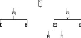 При классификации кредитов возможно использование модели CART (Classification and regression trees), что переводится как «классификационные и регрессионные деревья». Это непараметрическая модель, основные достоинства которой заключаются в возможности широкого применения, доступности для понимания и легкости вычислений, хотя при построении применяются сложные статистические методы. В «классификационном дереве» фирмы-заемщики расположены на определенной «ветви» в зависимости от значений выбранных финансовых коэффициентов; далее идет «разветвление» каждой из них в зависимости от следующих коэффициентов. Точность классификации при использовании данной модели – около 90%. Пример «классификационного дерева» представлен на рис. 2, где Кi — финансовый коэффициент; Рi — нормативное значение показателя; В — предполагаемый банкрот; S — предположительно устойчивое состояние.