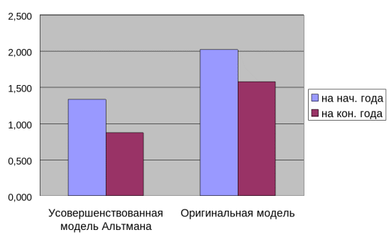 Проведя оценку кредитоспособности по оригинальной модели Альтмена можно сказать, что предприятие за отчетный финансовый год улучшило свое состояние. В начале отчетного года вероятность банкротства предприятия оценивалось как очень высокое при Z = 1,329, а в конце года предприятие в 3 раза увеличило выручку (на 308%, что составило 41099 тыс.руб.) и операционную на 1823% (75 тыс.руб.), что увеличило индекс кредитоспособности Альтмена вырос до 2,019. Это означает, что предприятие снизило вероятность банкротства с очень высокой до высокой.