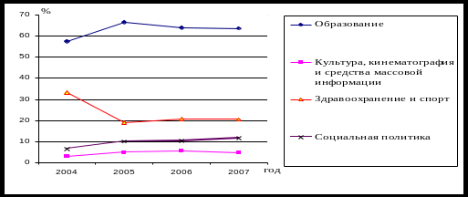 Из данных таблицы 3 видно, что наибольший удельный вес в расходах на социально – культурную сферу приходится на образование, то есть «львиная» доля досталась именно ему – 717 479 тыс. руб. (57,6%), 988 865 тыс. руб. (66,9%), 1 188 383 тыс. руб. (63,9%), 1 398 135 тыс. руб. (63,5%) в 2004, 2005,2006 и 2007 годах соответственно.