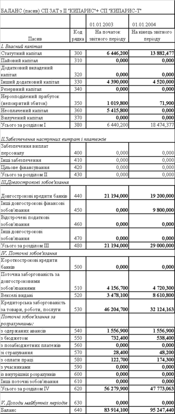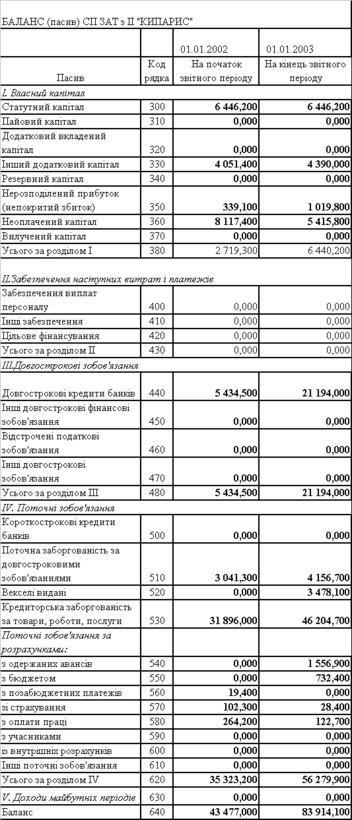Таблиця 2.6 Баланси ЗАТ СП з ІІ "КИПАРИС '' за 2002 2003 роки