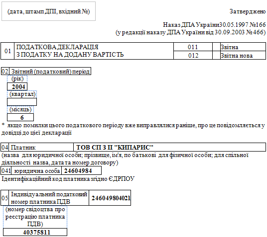 Таблиця А.1 Приклад податкової декларації по розрахунку ПДВ СП з ІІ "КИПАРИС" за липень 2004 року