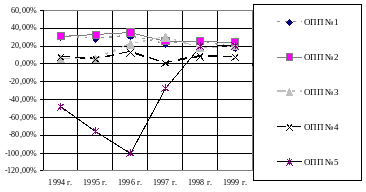 Помимо двух указанных ОПП, особое внимание по данным табл. 3.16 следует обратить также на ОПП №3, чистый финансовый результат которого в течение 1996-2001 гг. являлся предметом пристального внимания налоговых органов. Тем не менее, ситуацию удалось выправить и в 1999-2001 г. практически все предприятия сумели добиться положительных финансовых результатов.