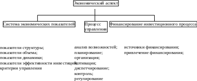 Экономический аспект – совокупность экономических частей инвестиционной стратегии, к которым относятся: система экономических показателей для оценки инвестиционной стратегии, управление, финансирование инвестиционного процесса. В рамках экономического аспекта выделяются основные методы, критерии и цели инвестиционной стратегии (рис. 3.8).