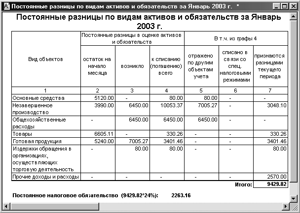 Рис. 2.2. Движение постоянных разниц в оценке активов и расчет постоянного налогового обязательства за январь 2003 года.