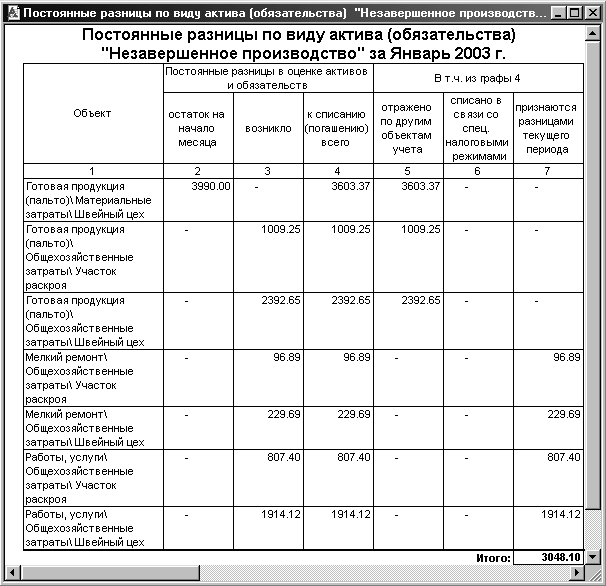 Рис.2.3. Расшифровка движения постоянных разниц в оценке незавершенного производства за январь 2003 года. Видна организация ОАО "Комкор" аналитического учета постоянных разниц – она такая же, как и по самим затратам основного производства