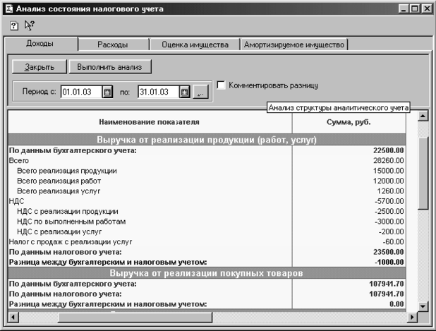 Приведем пример поиска ошибки. В январе 2003 года в бухгалтерском и в налоговом учете получен убыток. Следовательно, после проведения всех процедур расчета налога на прибыль в соответствии с ПБУ 18/02 на счете 68.4.2 сальдо быть не должно. Тем не менее, допустим, получилось дебетовое сальдо на сумму 240 руб. Это значит, что где–то имеется расхождение в доходах или расходах на сумму 1 000 руб. Отчет "Анализ состояния налогового учета" показывает, что доходы от реализации услуг в бухгалтерском учете меньше, чем в налоговом, на 1 000 рублей (рис. 2.9).