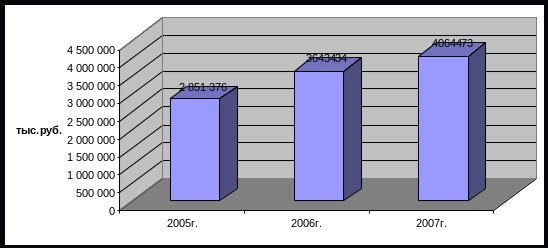 Из таблицы 2 следует, что выручка (нетто) от реализации товаров, продукции, работ, услуг (за минусом НДС, акцизов и платежей) (в дальнейшем – выручка от продаж) в 2006 году по сравнению с 2005 годом увеличилась на 792 млн. тыс. руб. или на 27,7 %. В 2007 году по сравнению с 2006 годом произошло снижение выручки то продаж на 421 млн. руб. или 11,5 % Динамика показателей выручки от продажи продукции, работ, услуг приведена на рис. 4.