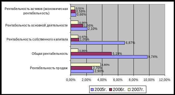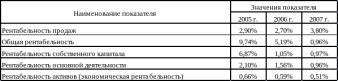 За анализируемый период рентабельность продаж увеличилась с 2,9 % до 3,8 %, Аналогичная тенденция прослеживается в отношении рентабельности продукции, которая за 2005-2006 гг. снижается с 12,94 до 0,22 процента, т.е. на 12,72 пункта. Рентабельность продукции рассчитывается делением прибыли от продаж на себестоимость продаж.