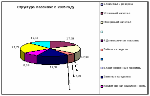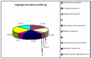 Значительная часть пассивов предприятия представлена капиталом и резервами. Удельный вес капитала и резервов составил за 2006 г. 65,36%, при этом доля уставного капитала составила 31,96%. Доля резервного капитала составила 11,64%. Доля нераспределенной прибыли составила 21,75% в общей величине пассивов организации.