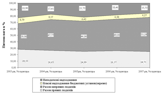 На рис. 1.4 наведена структура Державного бюджету України у 2003–2007 роках у розрізі джерел надходжень.