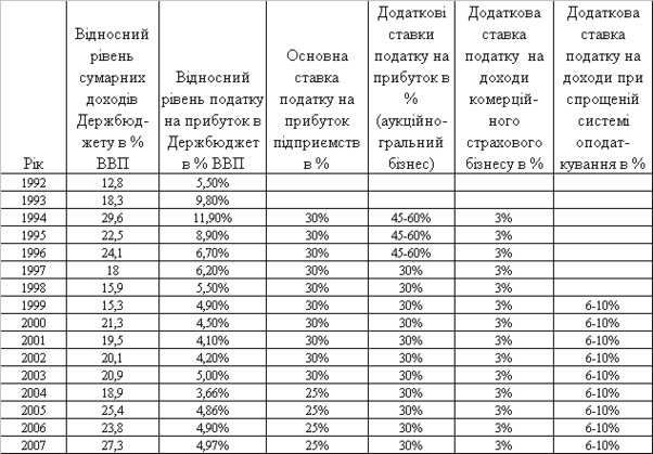 Таблиця 2.2. Динаміка ставок оподаткування прибутку підприємств в Україні в 1994–2007 роках та відносного рівня надходження прямого податку на прибуток підприємств в державний бюджет України в% ВВП (виключення фактору інфляції)