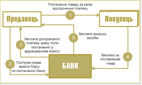 Фактор перераховує постачальнику суму грошового обов’язку за відрахуванням винагородження банку (дисконту).
