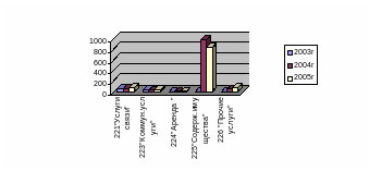 Как видно из диаграммы, наблюдается рост расходов по полученным услугам. Особенно ярко видно увеличение расходов в 2004 году. Расходы по статье 220 «Приобретение услуг» составили 1148 тыс.рублей, что на 1022,8 тыс.рублей больше по сравнению с 2003 годом. Такое объемное расходование средств вызвано тем, что в декабре 2003 года был начат капитальный ремонт отделения, который был завершен в 2004 году, а в 2005 году проводилось благоустройство прилежащей к зданию отделения территории и был завершен ремонт холла.