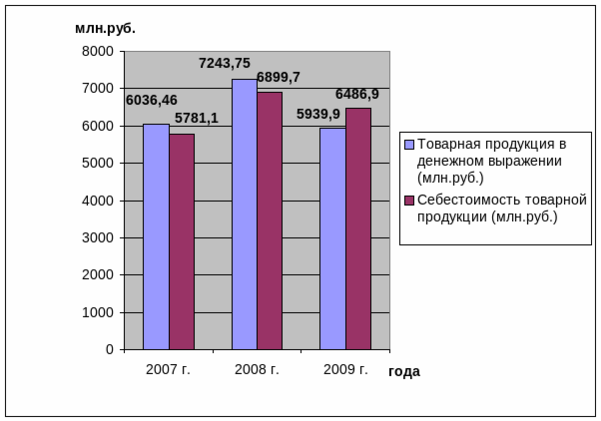 Рисунок 3 - Динамика показателя товарной продукции и себестоимости ОАО «Нижнекамскшина» за 2007-2009 г.г.