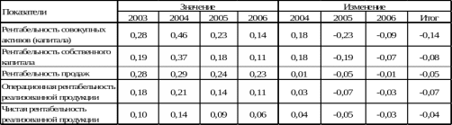 Показатели рентабельности за период 2005-2006гг. значительно снизились, что подтверждает выводы об ухудшении эффективности деятельности предприятия. Особенно существенно снизились показатели рентабельности совокупных активов, реализованной продукции.