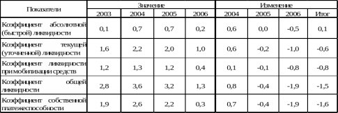 Анализ текущей ликвидности подтверждает, что в 2004-2005гг. предприятие было ликвидным, однако свои активы использовало нерационально. В 2006г. коэффициент текущей ликвидности ниже нормы, что указывает на необходимость систематической работы с дебиторами, чтобы обеспечить преобразование дебиторской задолженности в денежные средства.