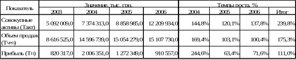 Темпы роста объема реализуемой продукции превышают Темп роста совокупных активов только в 2004г., а на протяжении 2005-2006гг. темпы роста объеме продаж значительно снизились. Такие тенденции свидетельствует о том, что лишь в 2004г. объем продаж рос быстрее экономического потенциала. Из этого можно сделать вывод о снижении интенсивности использования ресурсов на предприятии в 2005-2006гг.