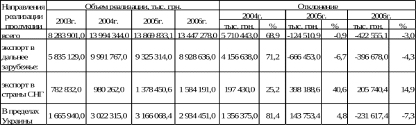 В течение 2006 года было реализовано продукции, работ, услуг на сумму 13 447 278 тыс. грн. Объем реализации товарной продукции в 2006г. по сравнению с 2005г. снизился на 422555 тыс. грн., вследствие снижения объема продаж листового проката на рынки дальнего зарубежья на 396678 тыс. грн., и объема реализации на внутреннем рынке – на 231617 тыс. грн. Объем экспорта в страны СНГ увеличился на 205740,4 тыс. грн. Снижение объемов реализации обусловлено ухудшением конъюнктуры мирового рынка черных металлов, и снижением спроса на металл на внутреннем рынке.