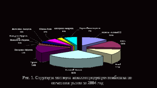 Рис. 3.2 – Структура экспорта металлопродукции комбината по сегментам рынка за 2004 год.