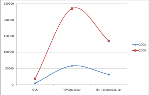 Таблица 3.11 – Суммы начисленных страховых взносов за 2008-2009 годы, в руб.