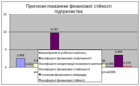 Якщо розглядати прогнозні показники фінансової стійкості підприємства, у разі якщо запропоновані заходи будуть реалізовані, то тут спостерігається також позитивна тенденція до покращення фінансового становища підприємства. Так, зменшиться коефіцієнт маневреності робочого капіталу на 4,67%, за рахунок зменшення частки запасів, тобто матеріальних, виробничих активів у власних обігових коштах; які обмежує свободу маневру власними коштами. У 2,8 разів буде підвищено коефіцієнт фінансової незалежності підприємства, який характеризує здатність підприємства виконувати свої зобов‘язання за рахунок власних коштів. Зменшиться на 4% значення коефіцієнту концентрації позикового капіталу. В 2,8 разів зменшиться показник фінансового лівериджу, який характеризує залежність підприємства від довгострокових зобов‘язань. Це має свідчити про зменшення фінансового ризику підприємства. На 16 % має бути покращенний коефіцієнт фінансової стійкості підприємства, що має свідчити про збільшення частки стабільних джерел фінансування у їх загальному випадку.
