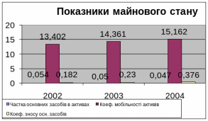За результатами розрахунків показників майнового стану можна зробити висновки, що питома вага основних засобів у загальних активах має тенденцію до зменшення, що є позитивною тенденцією. В порівнянні зі станом за 2002 рік цей показник дорівнював 5,4%, за 2003 рік ця частка складає вже 4,7%. Що стосується показника мобільності активів, то тут має місце позитивна тенденція до збільшення, що в загальному випадку позитивно характеризує діяльність підприємства. Якщо розглядати показники зносу основних засобів, то тут також спостерігається позитивна тенденція до зменшення частки основних засобів у загальному капіталі. За станом за 2004 рік цей показник зменшився майже у двічі.