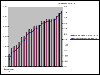 Причем величина риска обратно пропорциональна доходности и прямо пропорционально отклонению. Если принять величину отклонения за меру риска, то отрицательное отклонение не только снижает риск, но и доходность, и наоборот (рис. 6).