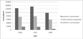 Себестоимость в 2008 году также уменьшилась на 19512 тысяч рублей. Прибыль от продаж уменьшилась на 11 903 тысяч рублей, несмотря на сокращение управленческих и коммерческих расходов. Общая сумма выручки от реализации продукции (работ, услуг) в 2008 году сократилась в 1,4 раза (на 36027 тысяч рублей). Причиной послужило общее ухудшение условий для предпринимательской деятельности, доминирующую роль в котором сыграл финансовый кризис.