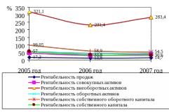 Из рисунка 2.8 следует, что рентабельность внеоборотных активов в 2005 году высока 321,1%, к 2007 году снизилась до 283,4%. Рентабельность собственного оборотного капитала в 2005 году – 99,05% к 2007 году снизилась до 54,5%. Рентабельность собственного капитала также снижется с 57 до 30,6%. Наглядно видно, что снижаются все показатели рентабельности.